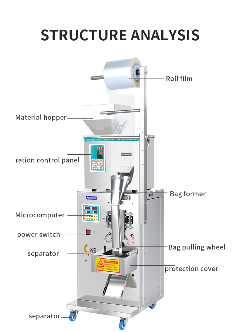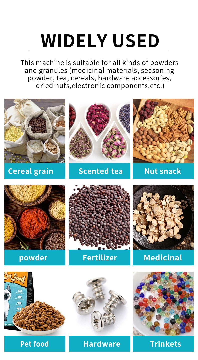 - Scope of application: tea/seeds/dry fruit/grain/flour/sugar/coffee/micro and small particles such as general dry and non-sticky solid materials