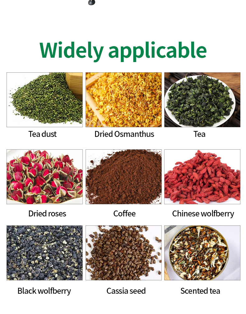 - Scope of application: tea/seeds/dry fruit/grain/flour/sugar/coffee/micro and small particles such as general dry and non-sticky solid materials